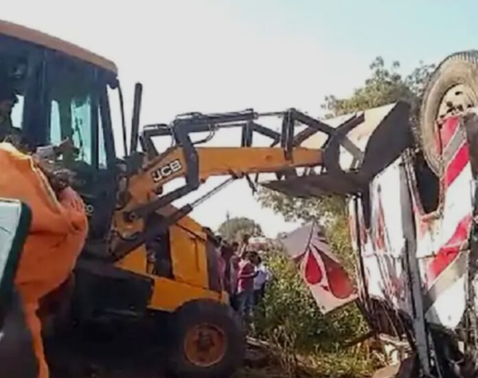 खंडवा: मध्य प्रदेश के खंडवा में एक तेज रफ्तार यात्री बस ने बाइक सवार को टक्कर मार दी। टक्कर मारने के बाद बस युवक को घसीटते हुए सड़क किनारे बने नाले में जाकर पलट गई। इस हादसे में युवक की मौके पर ही मौत हो गई है, जबकि बस में सवार 15 यात्री घायल बताए जा रहे हैं। युवक का शव बस में बुरी तरह से फंस गया था, जिसे जेसीबी की मदद से निकाला गया।
