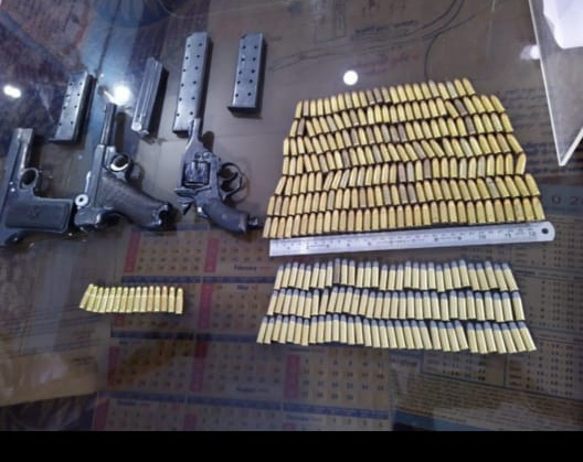 राजस्थान के एसओजी ने बड़ी कार्रवाई को अंजाम दिया है. एसओजी ने इंदौर पुलिस के साथ मिलकर ऑपरेशन चलाया, जिसमें हथियार तस्करों के खिलाफ बड़ी सफलता मिली. इंदौर के थाना गौतमपुरा इलाके में संयुक्त टीमों ने दबिश दी. यहां पर हथियारों के जखीरे के साथ एसओजी ने दो अभियुक्तों को दबोच लिया. इनके पास से एक रिवॉल्वर, दो पिस्टल, 4 मैग्जीन और 308 कारतूस (राउण्ड) बरामद किया गया है, साथ 9 एमएम के 199 कारतूस (राउण्ड) भी बरामद किये हैं.