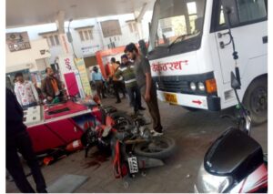 इंदौर के फूटी कोठी स्थित पेट्रोल पंप पर आज सुबह एक दुर्घटना होने की बात सामने आई है जिसमे एक शव वाहन अनियंत्रित होकर पेट्रोल पंप में जा घुसा।शव वाहन ने कई वाहनों औऱ पेट्रोल मशीन को टक्कर मारी।जिसके कारण मशीन गिरकर क्षतिग्रस्त हो गयी तो वही तीन चालक भी घायल हुए है।बताया जा रहा है कि शव वाहन यहाँ पेट्रोल भरवाने आया था तभी ब्रेक की जगह पर चालक ने एक्सीलेटर दबा दिया।जिसके कारण दुर्घटना हो गयी।
